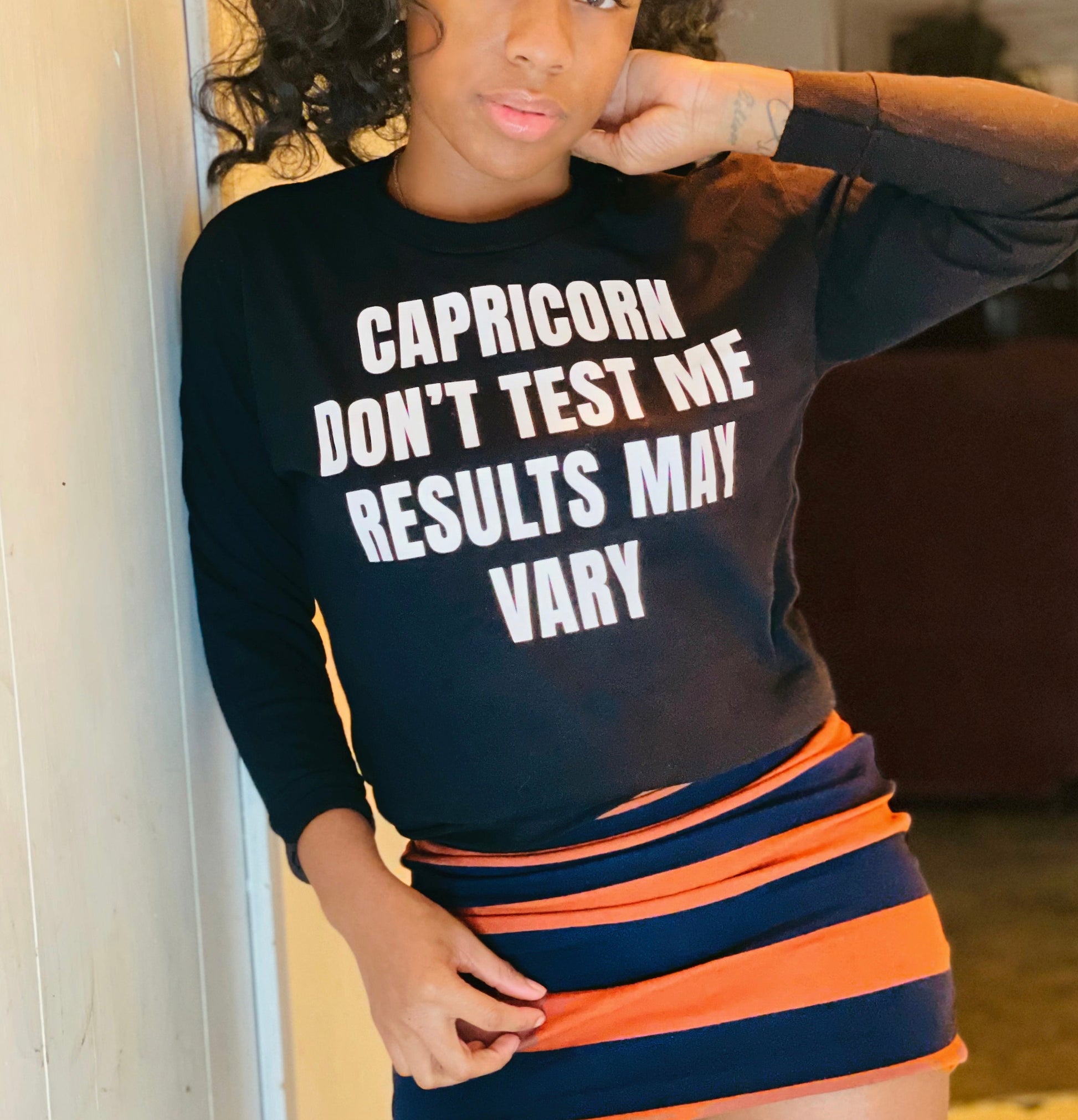 Your vibe, your rules, your zodiac power — all wrapped up in this bold statement. Perfect for the Capricorn queen who knows her worth and isn’t afraid to let the world know: don’t test me, or results may vary. Soft, comfy, and effortlessly sassy — this long sleeve tee is made for brunches, chill days, or whenever you want to serve looks and attitude.